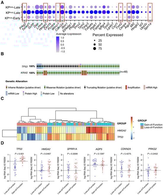 Differentially expressed genes (DEGs) are identified by comparing cancer cells from KPmut-Late with cancer cells from KPmut-Early and KPloss-Late groups. (A) Expression profiles of indicated marker genes in cancer cells from various groups are shown in a dot plot. Cancer cell-specific genes with elevated expression levels in KPmut-Late group were indicated by red boxes. (B) Samples from TCGA pancreatic cancer cohort with indicated (either loss-of-function or gain-of-function) TP53 mutations together with KRAS G12* mutations. (C) Heatmap showing the expression of selected marker genes in PDAC samples with loss-of-function or gain-of-function p53 mutations from the TCGA pancreatic cancer cohort. (D) Expression profiles of selected marker genes in PDAC samples with loss-of-function or gain-of-function p53 mutations. Statistical differences between groups in panel (D) were assessed by t-test.