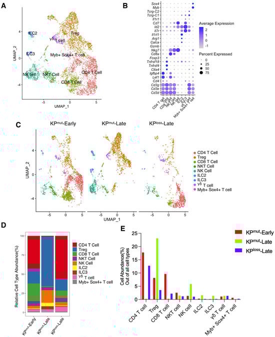 Subpopulation compositions of T cells and NK cells in KPmut-Early, KPmut-Late, and KPloss-Late tumors. (A,B) T cells and NK cells from KPmut-Early, KPmut-Late, and KPloss-Late tumors are classified into distinct subclusters in the UMAP plot (A) based on the diverse expression profiles of signature genes depicted in the dot plot (B). (C) UMAP plot comparing the T cells and NK cells compositions across three groups. (D) T and NK cell subtype abundance across KPmut-Early, KPmut-Late, and KPloss-Late groups. (E) abundance (%) of T and NK cells across KPmut-Early, KPmut-Late, and KPloss-Late groups.