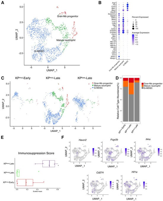 We next analyzed the differences in neutrophils across KPmut-Early, KPmut-Late, and KPloss-Late tumors. We stratified the total granulocyte/neutrophil population into three subclusters: Gran-Mo progenitor, G-MDSC, and Mature neutrophil (Figure 6A,B). We observed that KPmut-Late tumors exhibited the presence of Gran-Mo progenitor, G-MDSC, and Mature neutrophil. In contrast, KPloss-Late tumors and KPmut-Early tumors exhibited a predominant presence of G-MDSC (Figure 6C,D). These findings provide valuable insights into the cellular components of the samples and can aid in further research endeavors. Based on a recently published methodology [], we analyzed the signature scores of neutrophils in tumors. We observed that the immunosuppression signature of tumor-associated neutrophils was significantly upregulated in KPloss-Late tumors but was downregulated in KPmut-Late tumors (Figure 6E,F). Notably, KPloss-Late tumors exhibited similar profiles to KPmut-Early tumors in terms of pathways including angiogenesis, ECM remodeling, myeloid cell recruitment, proliferation, and neutrophil cytotoxicity, while KPmut-Late tumors revealed downregulation of several of the aforementioned pathways (Supplementary Figure S4).