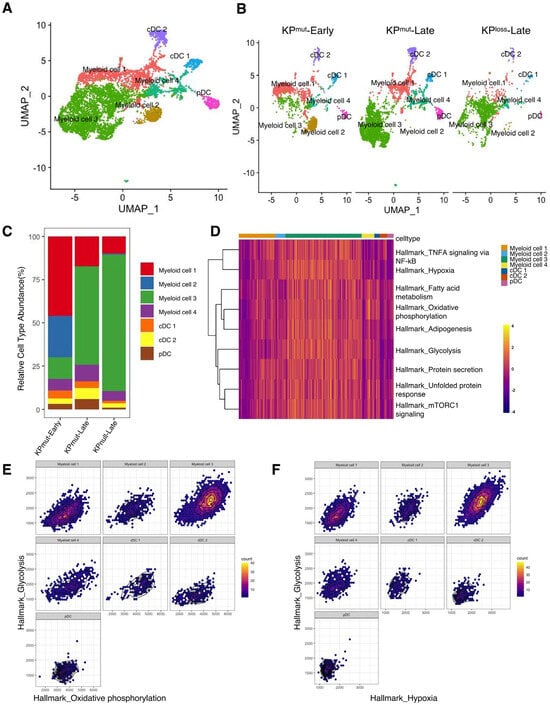 Compositions of myeloid cells and dendritic cells (DCs) in KPmut-Early, KPmut-Late, and KPloss-Late tumors. (A,B) Myeloid cells and DCs from KPmut-Early, KPmut-Late, and KPloss-Late tumors are segregated into distinct subclusters in the UMAP plot(A) and compared across the groups (B). (C) Myeloid cell and DC subtype abundance across KPmut-Early, KPmut-Late, and KPloss-Late groups. (D) Heatmap showing the expression profile of ‘Myeloid cell 3’-associated GSEA pathways in myeloid cell and DC subpopulations. (E) Relationship between Hallmark_glycolysis and Hallmark_oxidative_phosphorylation examined in myeloid cell and DC subtypes. (F) Correlation between Hallmark_glycolysis and Hallmark_hypoxia in myeloid cell and DC subtypes.