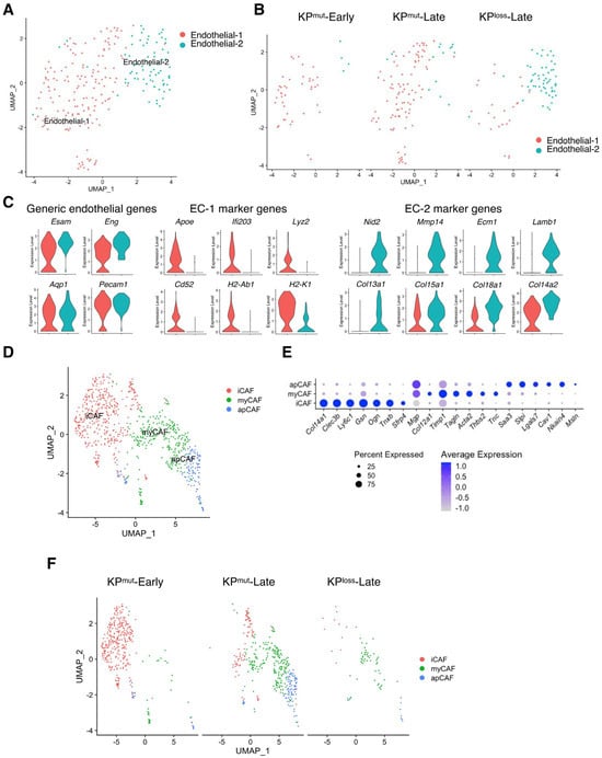 Subclusters of endothelial cells and cancer-associated fibroblasts (CAFs) in KPmut-Early, KPmut-Late, and KPloss-Late tumors. (A,B) Endothelial cells from KPmut-Early, KPmut-Late, and KPloss-Late tumors are segregated into distinct subclusters in the UMAP plot (A) and compared across the groups (B). (C) Signature genes of endothelial cells from KPmut-Early, KPmut-Late, and KPloss-Late tumors shown in a violin plot. (D,E) Inflammatory CAFs (iCAF), myofibroblastic CAFs (myCAF), and antigen-presenting CAF (apCAF) subclusters are denoted. CAFs obtained from KPmut-Early, KPmut-Late, and KPloss-Late tumors are segregated into aforementioned subclusters in the UMAP plot (D) based on the diverse expression profiles of signature genes depicted in the dot plot (E). (F) UMAP plot comparing the CAF subtype compositions across three groups.