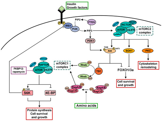 - Sarbassov, D.D.; Ali, S.M.; Kim, D.H.; Guertin, D.A.; Latek, R.R.; Erdjument-Bromage, H.; Tempst, P.; Sabatini, D.M. Rictor, a novel binding partner of mTOR, defines a rapamycin-insensitive and raptor- independent pathway that regulates the cytoskeleton. Curr. Biol. 2004, 14, 1296–1302. [Google Scholar] [CrossRef]