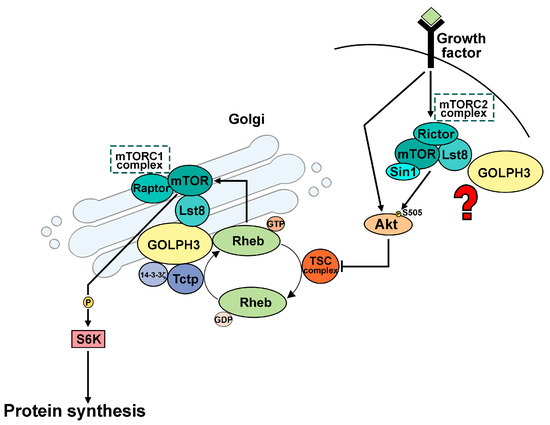 - Hao, F.; Kondo, K.; Itoh, T.; Ikari, S.; Nada, S.; Okada, M.; Noda, T. Rheb localized on the Golgi membrane activates lysosome-localized mTORC1 at the Golgi-lysosome contact site. J. Cell Sci. 2018, 131, jcs208017. [Google Scholar] [CrossRef]