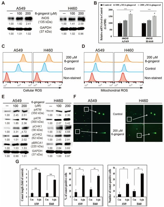6-Gingerol induced ROS formation in A549 and H460 cells. (A) Western blotting of iNOS protein expression was incubated with 100 or 200 μM 6-gingerol for 48 h. (B) qRT-PCR showing illustrative iNOS expression. Next, controls were set to 100. *** p < 0.001 (ANOVA); # p < 0.001 vs. control. (C,D) Flow cytometry assay performed for detecting cellular and mitochondrial ROS. A plot of the percentage of cells with cellular and mitochondrial ROS induction. (E) The results of Western blotting indicate pH2AX, pATM, pATR, pCHK1, pCHK2, and pBRCA1 protein expression. (F) Comet assay images from fluorescent microscopy analysis at ×10 and ×40 magnification show fragmented DNA migration from the nucleoid body that forms a comet tail. (G) Graphical representation of the comet length analyzed as the fold change versus the control and percentage of comet-positive cells with 6-gingerol treatment in lung cancer cells. ** p < 0.01; *** p < 0.001 (Student’s t-test).