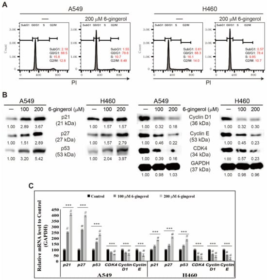 6-Gingerol induced cell cycle arrest in A549 and H460 cells. (A) Flow cytometry analysis using PI staining showed cell cycle distribution after 48 h treatment with 200 µM 6-gingerol. (B) Western blotting of A549 and H460 cells after 48 h treatment with 100 and 200 µM 6-gingerol showing p21, p27, p53, cyclin D1, cyclin E, and CDK4 expression. (C) qRT-PCR results show expression of cell cycle checkpoint genes. Representative cyclin D1, cyclin E, CDK4, p21, p27, and p53 mRNA expression is shown. Controls were set to 100. *** p < 0.001 (ANOVA test); # p < 0.001 vs. control.