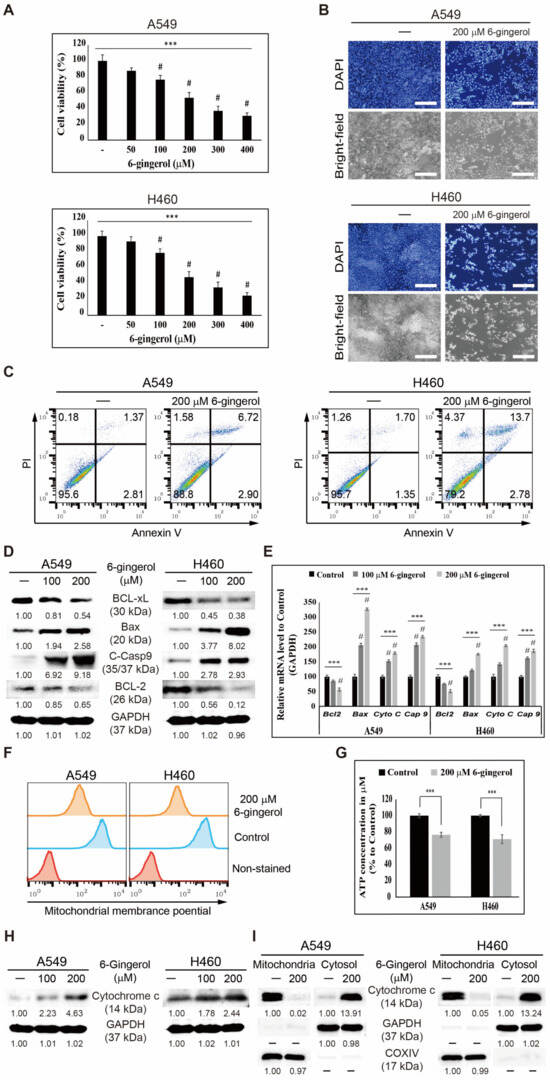 6-Gingerol induced the intrinsic apoptosis pathway in A549 and H460 cells. (A) Cell death analysis via the MTT assay in A549 and H460 cells after treatment with increasing concentrations of 6-gingerol for 48 h. *** p < 0.001 (ANOVA test); # p < 0.001 vs. control. (B) 6-Gingerol induced nuclear aberrations in NSCLC cells. DAPI staining and phase-contrast microscopy images show abnormal nucleus formation induced by 48 h treatment with 200 µM 6-gingerol. Representative photographs are presented. Scale bar 200 μm. (C) Annexin V-FITC vs. PI staining analysis after incubation with 200 μM 6-gingerol for 48 h. (D) Western blotting of BAX, BCL-2, BCL-xL, and C-Casp9 proteins. (E) qRT-PCR showing illustrative BAX, BCL-2, and caspase-9 gene expression. Next, Cp values were normalized to GAPDH mRNA. Controls were set at 100. *** p < 0.001 (ANOVA test); # p < 0.001 vs. control. (F) Flow cytometry analysis for mitochondrial membrane potential. (G) Plot of ATP concentration after treatment with 200 µM 6-gingerol. *** p < 0.001 (Student’s t-test). (H) Western blotting showing cytochrome c expression. (I) Western blotting of cytochrome c in cytosolic and mitochondrial fractions. GAPDH and COX IV were the controls for cytosolic and mitochondrial fractions, respectively.