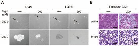 6-Gingerol can inhibit the proliferation of cancer cells by generating ROS and activating DDR, cell cycle arrest, or mitochondrial apoptosis. These abilities of 6-gingerol led to the investigation into cancer stemness and tumor metastasis. Tumorsphere formation in A549 and H460 cells with or without 6-gingerol treatment was investigated to analyze the cancer stemness (Figure 4A). The results show large tumorsphere formation in nontreated control cells after 7 days, whereas 200 μM 6-gingerol drastically suppressed tumorsphere formation. These results suggest the ability of 6-gingerol to act against cancer stem cells within cancer cells. The capability of 6-gingerol to act against tumor metastasis was investigated by conducting a cell invasion assay in NSCLC cells (Figure 4B). These results show fewer invaded cells in 6-gingerol-treated cells compared to nontreated control cells. As tumor invasion is a key process in tumor metastasis, inhibition of tumor invasion by 6-gingerol shows a hint of its antimetastatic ability against two NSCLC cells.