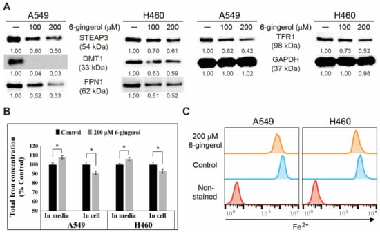 6-Gingerol inhibited iron metabolism in A549 and H460 cells. (A) Western blotting of TFR1, DMT1, STEAP3, and FPN1 after incubation with 100 or 200 μM 6-gingerol for 48 h. (B) Iron assay of the total iron concentration. * p < 0.1 (control vs. 6-gingerol; Student’s t-test). (C) Flow cytometry of Fe2+ in A549 and H460 cells after treatment with 200 μM 6-gingerol for 48 h.