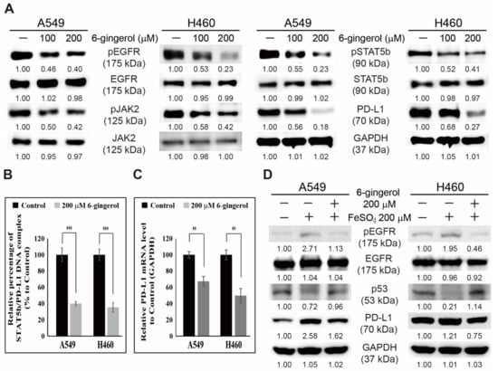 6-Gingerol inhibited EGFR/JAK2/STAT5b/PD-L1 signaling in A549 and H460 cells. (A) Western blotting of after 48 h treatment with 100 and 200 µM 6-gingerol showed pEGFR, EGFR, pJAK2, JAK2, pSTAT5, STAT5b, and PD-L1 protein expression. (B) ChIP assay analysis after A549 and H460 cells were incubated with 200 µM 6-gingerol for 48 h showed suppression of STAT5 binding to the PD-L1 promoter. The relative binding of STAT5 to the PD-L1 gene promoter was expressed as a percentage of control. Statistical analysis was performed using Student’s t-test (*** p < 0.001). (C) The expression levels of PD-L1 mRNA were detected after 6-gingerol treatment. Statistical analysis was performed using Student’s t-test (** p < 0.01). (D) Western blotting of pEGFR, EGFR, p53, and PD-L1 in A549 and H460 cells incubated with 200 µM FeSO4 or 200 μM 6-gingerol for 48 h.