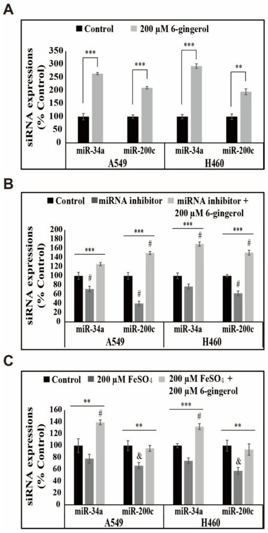 6-Gingerol regulated miR-34a and miR-200c expression in A549 and H460 cells. (A) Representative qRT-PCR of miR-34a and miR-200c transcripts. Cp values were normalized to U6 mRNA. Controls were set to 100. ** p < 0.01; *** p < 0.001 (Student’s t-test). (B) Representative qRT-PCR of miR-34a and miR-200c transcripts after treatment with an miRNA inhibitor with or without 200 μM 6-gingerol for 48 h. Cp values were normalized to U6 mRNA. Controls were set to 100. *** p < 0.001 (ANOVA test); # p < 0.001 vs. control. (C) Representative qRT-PCR of miR-34a and miR-200c in A549 and H460 cells treated with 200 μM 6-gingerol for 48 h, followed by 200 µM FeSO4 for an additional 48 h. Cp values were normalized to U6 mRNA. Controls were set to 100. ** p < 0.01; *** p < 0.001 (ANOVA test); & p < 0.01 vs. control; # p < 0.001 vs. control.