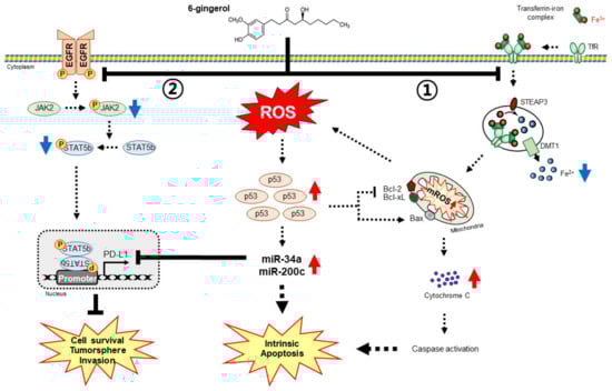 The ability of 6-gingerol to enhance mitochondrial apoptosis in two NSCLC cells was determined via ROS generation, DDR, and cell cycle arrest induction. Iron metabolism plays a vital role in the anticancer activity of 6-gingerol by regulating the EGFR/JAK2/STAT5b pathway and mediating PD-L1 expression. Iron homeostasis also regulates miR-34a/miR-200c expression to inhibit PD-L1 expression upon 6-gingerol treatment, suggesting the role of iron metabolism in the anticancer ability of 6-gingerol against NSCLC cells (Figure 8).