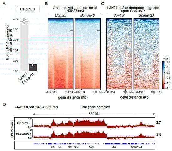 To gain insight into Bon’s role within the epigenetic landscape, we first performed ChIP-seq analysis of genome-wide distribution of repressive H3K27me3 marks in Bon-depleted ovaries. We used ovaries from flies expressing short hairpin RNAs against bon using a nos-Gal4 driver to achieve the germline-specific knockdown of Bon (BonusKD). As a control, we used ovaries from their siblings that lack the short hairpin. This approach, utilizing siblings as controls, was chosen to minimize genetic variability. In a previous study, we demonstrated the effectiveness of our knockdown system, showing an 88% reduction in Bon gene expression via RT-qPCR and confirming this reduction in germ cells using confocal imaging []. In our current analysis, we verified the efficiency of Bon knockdown via RT-qPCR, revealing an 85% reduction in ovarian Bon expression, consistent with our previous findings (Figure 1A). The analysis of normalized H3K27me3 ChIP-seq signals across ± 1 kb of the transcription start sites (TSSs) and the transcription end site (TES) of all genes in the Drosophila genome revealed distinct genic distributions, with H3K27me3 covering the gene body in both the control and Bon-depleted ovaries (Figure 1B and Figure S1A). Bon depletion does not alter the levels of the H3K27me3 mark over protein-coding genes, including H3K27me3-decorated genes that become upregulated upon Bon knockdown, as demonstrated by RNA-seq (Figure 1C). To validate our ChIP-seq analysis, we examined the Hox gene clusters, well known for their spatial compartmentalization and significant enrichment of the H3K27me3 mark [,]. The Antennapedia (Antp) Hox gene complex, located on chromosome 3R in Drosophila melanogaster, displayed an unaltered and complete coverage of H3K27me3, confirming the validity of our ChIP-seq analysis and the lack of an effect following the germline-specific knockdown of Bon (Figure 1D). Therefore, our results suggest that repression of Bon-regulated genes is independent of the H3K27me3 mark.