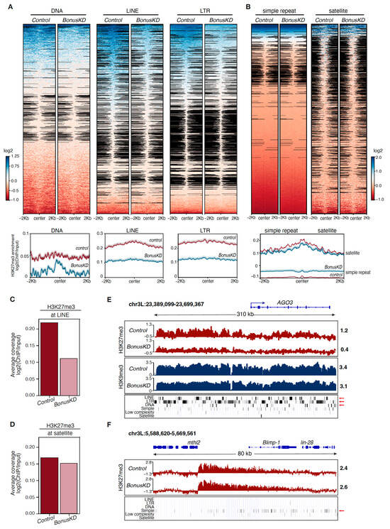 The PRC2 complex has been widely recognized for its role in depositing the H3K27me3 histone mark on protein-coding genes, while transposable elements (TEs) are repressed via DNA methylation and/or the H3K9me3 mark. However, recent studies have revealed that H3K27me3 is enriched over TE sequences across distantly related eukaryotes [,,,]. We consequently expanded our analysis to explore the impact of Bon knockdown on the H3K27me3 profile of repetitive sequences. A closer examination of diverse repetitive sequences unveiled that Bon depletion led to a reduction in H3K27me3 occupancy over LTR and LINE retrotransposon sequences, as well as DNA transposons (Figure 2A). In contrast, highly repeated satellites and simple repeats revealed no significant alterations (Figure 2B). Additionally, when we compared the average H3K27me3 enrichment across all LINE sequences in Bon-depleted ovaries and the control ovaries, we noted a reduction in the H3K27me3 signal following Bon knockdown, unlike at satellites, where we did not observe any significant changes (Figure 2C,D). For example, the region upstream of the gene AGO3 that contains multiple LINE, LTR, and DNA transposons exhibited a significant depletion of the H3K27me3 mark following Bon depletion (Figure 2E). It is noteworthy that this region is also covered by the H3K9me3 repression mark, which remained largely unchanged following Bon depletion. Thus, though Bon influences the accumulation of H3K27me3 marks over transposon regions, the concurrent presence of H3K9me3 appears to be sufficient to repress their transcription (Figure 2E). In comparison, the accumulation of H3K27me3 at a distinct region enriched in simple repeats remained unaltered following Bon knockdown (Figure 2F). Taken together, our results indicate that Bon is required for the accumulation of the H3K27me3 mark across different classes of transposable elements, but not simple repeats.