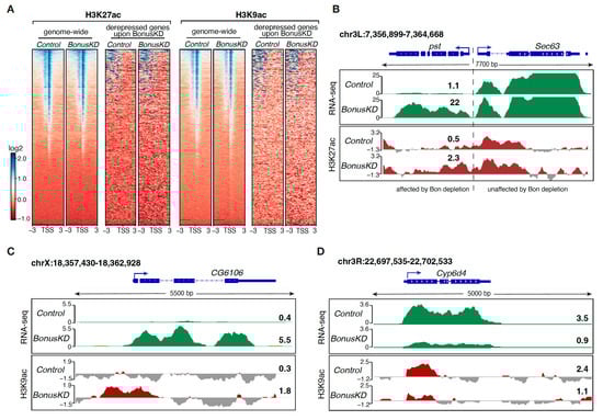 After exploring the effect of Bon on repressive chromatin marks, we studied the acetylation of H3K27 and H3K9, which serve as catalysts for the establishment of open chromatin and are associated with active transcription. H3K27ac has been uncovered as a key player in cell identity control and a characteristic chromatin signature of active enhancers [,], while the H3K9ac mark is considered a hallmark of active gene promoters []. A genome-wide analysis revealed substantial occupancy of these activation marks at TSS and TSS-proximal regions, aligning with their known presence in the proximity of active promoters. Depleting Bon did not affect the overall distribution patterns of H3K27ac and H3K9ac of the majority of TSSs genome-wide (Figure 3A and Figure S1B,C); however, a subset of genes that become aberrantly expressed or silenced upon Bon depletion exhibited a concomitant accumulation or loss of these marks, respectively. For example, Bon depletion leads to ectopic activation of the pst gene and associated accumulation of the H3K27ac mark near TSS-proximal regions (Figure 3B), while activated CG6106 displays H3K9ac accumulation at its TSS (Figure 3C). In contrast Cyp6d4, which experienced a stark decline in expression upon Bon depletion, exhibited a notable decrease in H3K9ac levels (Figure 3D). Overall, our results indicated that only a small fraction of Bon-regulated genes depend on the H3K9ac or H3K27ac activation marks. Interestingly, a gain or loss of the H3K9 and H3K27 acetylation signals at promoters did not correlate with the fold change in the corresponding genes’ expression level, pointing towards complex and context-dependent regulatory relationships that may involve multiple pathways and mechanisms.