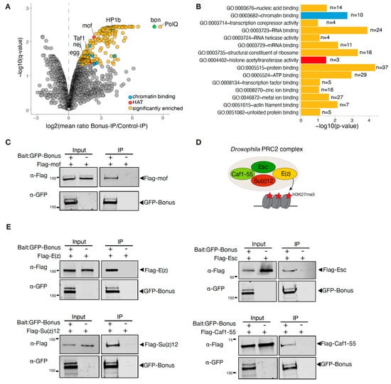 Bonus interacts with histone acetyltransferases and with the PRC2 complex. (A) Bon co-purifies with several proteins in the ovaries. Volcano plot showing fold enrichments versus statistical significance (determined via quantitative MS) of proteins in GFP-Bonus co-immunoprecipitants versus control (log2FC > 1, adjusted p-value < 0.05, Benjamini–Hochberg; 2 biological replicates; experimental flies express GFP-tagged Bon; flies expressing GFP served as a control). Bon and selected interacting proteins are labeled. (B) Gene ontology (GO) molecular function analysis of identified partners of Bon. Bar plot illustrates the analysis for proteins that were significantly enriched compared to the control (log2FC > 1, adjusted p-value <0.05, Benjamini–Hochberg). Only selected GO terms above the established cut-off criteria (p-value < 0.01 and >2 genes per group) are shown. The number of proteins associated with specific functional terms is displayed on the bars. (C) Bon interacts with MOF. Western blot analysis of immunoprecipitation experiment using GFP nanotrap beads from S2 cells co-expressing GFP-Bonus and Flag-tagged MOF. Lysate not expressing GFP-Bonus was used as a negative control. (D) Model showing subunits of the Drosophila PRC2 complex. (E) Bon interacts with components of the PRC2 complex: E(z), Su(z)12, Caf1-55, and Esc. Western blot analysis of immunoprecipitation experiment using GFP nanotrap beads from S2 cells co-expressing GFP-Bonus and Flag-tagged E(z), Flag-tagged Esc, Flag-tagged Su(z)12, and Flag-tagged Caf1-55. Lysates not expressing GFP-Bonus were used as negative controls.