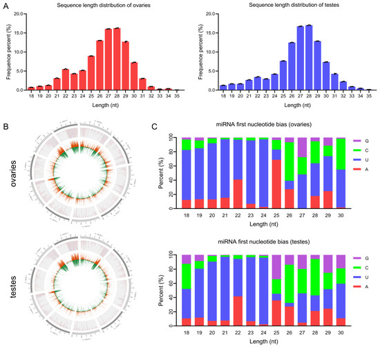 Characterization of gonadal smaRNAs and miRNAs in common carp. (A) Length distribution of smaRNA sequences in the ovaries and testes. (B) Distribution of gonadal miRNAs on chromosomes. The outermost circle is designated as the chromosome to be displayed. Orange and green represent reads mapped to positive and negative chains, respectively. (C) First base preference of known miRNAs ranging in length from 18 to 30 nt in the ovaries and testes. The horizontal axis represents the length of the miRNA, while the vertical axis represents the ratio of A/U/C/G in the first base.