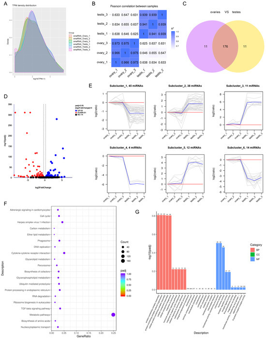 Identification of differentially expressed miRNAs and functional analysis of their target genes in ovaries and testes. (A) TPM density distribution of different samples. The horizontal axis is the log10 (TPM + 1) value, and the vertical axis is the density distribution. (B) The correlation analysis of different samples. (C) Venn diagram of miRNAs expressed in ovaries and testes. (D) Volcano map of differentially expressed miRNAs. Blue dots represent the up-regulated miRNAs, and red dots represent the down-regulated miRNAs in ovaries compared to testes. (E) Clustering of the 124 DE miRNAs into six subclusters. Gray lines represent the relative expression levels of each gene; blue lines represent the mean value in each subcluster; red lines represent the reference. (F) The KEGG pathways with the lowest p-value by DE miRNA target genes. (G) The GO terms with the lowest p-value by DE miRNA target genes. BP: biological process; CC: cell component; MF: molecular function.