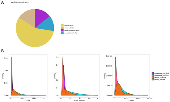 Characteristics of novel lncRNA transcripts identified in this study. (A) Classification and proportion of novel lncRNAs. antisense: overlapped with the antisense strand of one or more exons of a protein-coding gene; lincRNA: located in the intergenic region; sense overlapping: overlapped with sense strand of one or more exons of a protein-coding gene; sense intronic: located in the intronic region of a coding gene and does not intersect with any of exons on the same strand. (B) Comparison of the characteristics of all the lncRNAs and mRNAs.