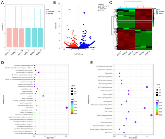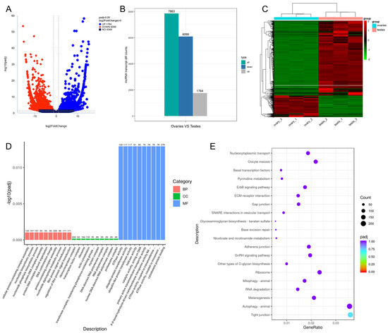 Analysis of DE lncRNAs between ovaries and testes. (A) Volcano map of DE lncRNAs. The blue dots represent the up-regulated lncRNAs, and red dots represent the down-regulated lncRNAs in ovaries compared to testes. (B) The number of DE lncRNAs. (C) Cluster analysis of DE lncRNAs. (D) The GO terms with the lowest p-value by DE lncRNA target genes from co-expression analysis. BP: biological process; CC: cell component; MF: molecular function. (E) The KEGG pathways with the lowest p-value by DE lncRNA target genes from co-expression analysis.