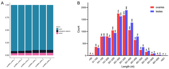 In total, we obtained 55.93 G circRNA sequencing raw data, and after data trimming by removing low-quality reads, ~344 million clean reads were retained. On average, 93.53% of clean reads in the ovaries and 85.40% in the testes were mapped to the reference genome (Table S15). Then, 6611 circRNAs were identified using CIRI and find_circ software, and 6603 RNAs were retained for subsequent analysis after removing the duplicates (Table S16). A total of 90.29% of circRNAs were transcribed from exon regions, while only 4.63% and 5.08% of circRNAs were transcribed from intron and intergenic regions, respectively (Figure 5A). The average length of circRNAs in the ovaries was approximately 284 nt, while the average length in the testes was approximately 298 nt. More than 60% of circRNAs were between 200 nt and 400 nt in length, and only 3.37% were longer than 500 nt (Figure 5B).