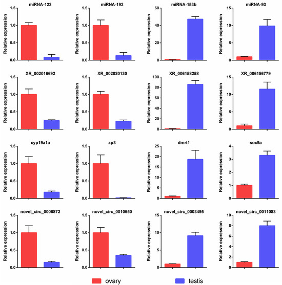 The relative expression levels of four miRNAs, lncRNAs, mRNAs, and circRNAs were examined by qPCR, respectively. Primers used for qPCR are listed in Table S19. As shown in Figure 7, miR-122, miR-192, XR_002016692, XR_002020130, cyp19a1a, zp3, novel_circ_0006872, and novel_circ_0010650 showed ovary-biased expression, while miR-153b, miR-93, XR_006158258, XR_006156779, dmrt1, sox9a, novel_circ_0003495, and novel_circ_0011083 showed testis-biased expression. The expression trends of the 16 selected RNAs by qPCR were consistent with those of the transcriptomic profile analysis, demonstrating the reliability of the sequencing data.