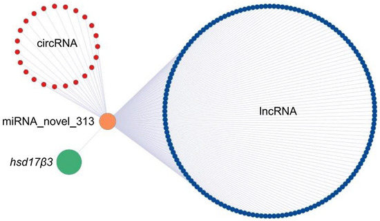 The crosstalk between the competing endogenous RNAs (ceRNAs) is a vital mechanism by which ncRNAs function. lncRNAs or circRNAs can sponge off miRNAs and then regulate gene expression. We analyzed the binding sites of miRNAs on lncRNAs and circRNAs and then established the lncRNA/circRNA-miRNA-mRNA regulatory relationship (Table S20). For example, 17-beta hydroxysteroid dehydrogenase 3, which catalyzes the conversion of androstenedione to testosterone, is encoded by the hsd17β3 gene. We predicted that multiple circRNAs and lncRNAs might compete with hsd17β3 mRNA for binding to a new miRNA named novel_313. These circRNAs and lncRNAs might act as spongers to regulate the expression of hsd17β3 (Figure 8; Table S21).