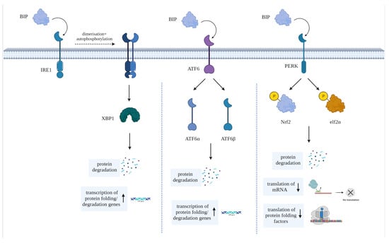 To counteract ER stress, cells activate a set of in-built signaling pathways collectively known as the unfolded protein response (UPR). As shown in Figure 1, the UPR comprises three main signaling pathways initiated by ER transmembrane proteins: Inositol-Requiring Enzyme 1 (IRE1), Protein Kinase R-like ER Kinase (PERK) and Activating Transcription Factor 6 (ATF6). These pathways lead to the expression of genes involved in chaperone protein production, ER expansion, and protein degradation [35]. This process occurs as a means of cell preservation and to promote the recovery from the erroneous production or accumulation of misfolded proteins. However, if attempts to reinstate ER homeostasis fail, UPR stimulates apoptosis [33].