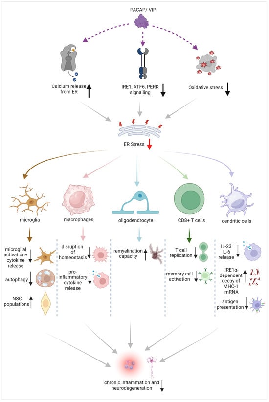 Based on the evidence provided, there is strong potential to eliminate the exacerbated and chronic activation of resident and peripheral immune cells by suppressing ER stress in immune cells [107]. This could include dampening ER stress triggers via the modulation of calcium signaling, inhibiting ER stress responses by tackling specific branches of the UPR such as XBP1 or IRE1α kinase, or by implementing antioxidative strategies [107,108]. Such activities seem to be regulated by the PACAP/VIP system (summarized in Figure 2). However, before such remedial strategies can be applied, it is paramount to first determine the therapeutic window during which UPR inhibition remains beneficial as well as defining a plan to avoid potential off-target effects in normally functioning immune cells [108,109].