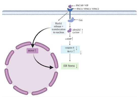 Firstly, PAC1, VPAC1 and VPAC2 are typically preferentially linked to Gαs, a heterotrimeric G-protein that promotes the cyclic adenosine monophosphate (cAMP)-dependent pathway via stimulation of adenylyl cyclase. The activation of adenylyl cyclase, in turn, results in increased cAMP accumulation [115]. Importantly, cAMP elevation triggers the inhibition of the apoptotic marker caspase-3, coupled with increased levels of the anti-apoptotic protein Bcl-2 [82]. Furthermore, the capacity of PACAP to release the receptor of activated C kinase-1 (Rack1) from the NMDA receptor it is bound to is well recognized [117]; this enables the translocation of Rack1 to the nucleus wherein it upregulates BDNF, who can then dampen the damaging effects of ER stress [118,119]. PACAP also suppresses expression of Bcl-2-associated X protein (Bax), a leading pro-apoptotic protein in the ER stress-induced apoptotic pathway, especially in neurons [120,121]. Considering the relevance of these molecular targets in counteracting apoptosis caused by ER stress, it is conceivable that PACAP (and perhaps VIP)-mediated activation of cAMP, reduced Bax and caspase-3 activities, along with the upregulation of Bcl-2 and BDNF, may result in the direct or indirect blockade of ER stress-induced apoptosis in the CNS [75,120,122].