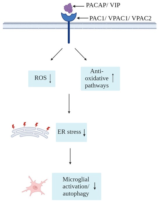 Oxidative stress and ER stress are two interconnected cellular processes that have significant implications in the maintenance of microglial physiology. Indeed, oxidative stress directly modifies proteins involved in ER function [123] and disturbs calcium homeostasis [124], both of which are crucial for proper ER functioning. In contrast, ER stress itself, via the activation of the UPR, can also lead to the production of reactive oxygen species (ROS) as a byproduct [125]. As such, the interplay between oxidative stress and ER stress can create a feedback loop, where each stressor exacerbates the other, potentially leading to a vicious cycle of cellular dysfunction and damage. Understanding the influence of PACAP/VIP on microglia oxidative mechanisms could offer an additional tool to arrest this concatenation of events, hence improving microglial health.