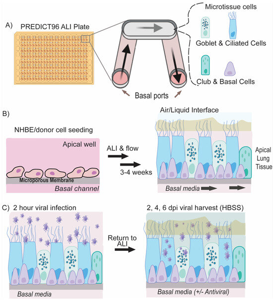 PREDICT96-ALI plates were prepared as previously described [27] (Figure 1B). Living donor-derived cells were thawed and cultured to confluency prior to introduction into PREDICT96-ALI plates. Cells were seeded at 15,000 cells per device in a 3 µL volume directly onto the membrane. Commercially sourced cells were thawed and plated at 10,000 cells per device in a 3 µL volume directly onto the membrane. Cell/tissue growth occurred for 48 h in submerged proliferation media (SAGM + 4i: SAGM (Lonza, Lexington, MA, USA), 100 U/mL penicillin–streptomycin (Thermo Fisher), 5 μM ROCKi (Tocris), 1 μM A-83-01 (Tocris), 0.2 μM DMH-1 (Tocris), and 0.5 μM CHIR99021 (Tocris)), followed by the initiation of differentiation using 48 h of submerged differentiation media (HBTEC-ALI, Lifeline Cell Technology, plus 100 U/mL penicillin/streptomycin) and the subsequent induction of an ALI at day 5 of culture, as previously reported, using either custom-ALI media [27] or Pneumacult-ALI media (STEMCELL Technologies). Tissues were matured over the course of 4 weeks in ALI culture with active pumping prior to viral infection experiments. To remove accumulated mucus from the apical surface of the maturing tissue, 100 µL of 1× Hank’s Balanced Salt Solution (HBSS, Sigma) was added to the apical surface of each tissue and incubated on the tissues for 1 h at 37 °C, subsequently followed by an additional 5 min wash with 100 µL of 1× HBSS at room temperature every 7 days (d).