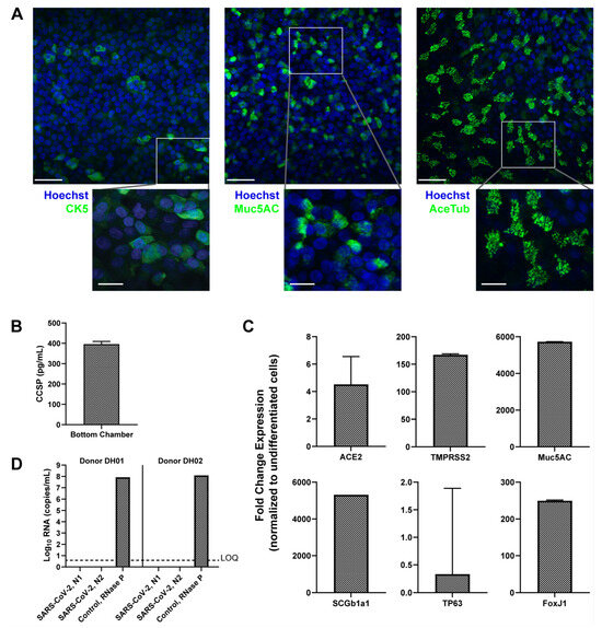 Donor cells derived from research bronchoscopy and differentiated in PREDICT96-ALI exhibit the structure and composition of the mature human airway. (A) Representative max projection immunofluorescence (IF) images demonstrating the presence of basal (CK5), goblet (Muc5AC), and ciliated (acetylated-tubulin or AceTub) cells in healthy, uninfected pseudostratified PREDICT96-ALI airway tissue derived from donor DH02 and grown for 4 weeks at air liquid interface (ALI), taken at 40× magnification and shown with a 50 µm scale bar. The inset images have a 20 µm scale bar. Tissues were counter-stained for dsDNA with Hoechst stain. (B) Club Cell Secretory Protein (CCSP) detection in PREDICT-ALI airway experiments containing donor DH01 at 4 weeks ALI. Media samples collected from the basal microfluidic chamber of each PREDICT96-ALI tissue exhibit detectable levels of CCSP (mean ± SEM of n = 6). Tissue media samples randomly selected from two independent, representative experiments. (C) Relative fold change in expression of mRNA transcripts from differentiated airway tissues in PREDICT96-ALI derived from donor DH01. Reverse transcription quantitative polymerase chain reaction (RT-qPCR) was used to detect transcripts, using GAPDH as a reference gene and normalizing it to undifferentiated cells (mean fold change expression ± SEM). n = 12 healthy tissue replicates selected at random from two representative PREDICT96-ALI experiments. (D) Confirmation that epithelial cells isolated from donors DH01 and DH02 are SARS-CoV-2 negative, as determined by RT-qPCR detecting two regions in the SARS-CoV-2 nucleocapsid (N) gene, N1 and N2. RNaseP probed as a tissue sample control. Limit of quantification (LOQ) indicates copy number corresponding to Ct values of ≥40 cycles. Samples that did not meet the minimum signal intensity (undetermined) after 40 PCR cycles are excluded. Data presented as mean Log10 viral RNA copies/mL ± SEM (n = 2).