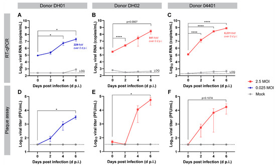 SARS-CoV-2-inoculated PREDICT96-ALI airway tissues from multiple donors yield replicative virus by RT-qPCR and plaque assay. (A–C) RT-qPCR analyses for SARS-CoV-2 nucleoprotein RNA copies in the apical wash of PREDICT96-ALI airway tissue at 0, 2, 4, and 6 days post infection (d.p.i.). Panels represent unique donors: (A) donor DH01 (n = 12 tissue replicates per time-point and condition); (B) donor DH02 (n = 12 tissue replicates for mock, n = 18 for 2.5 MOI); (C) donor 04401 (n = 12 tissue replicates for mock, n = 24 for 2.5 MOI). Fold increase in average RNA titer between days 0 and 6 indicated for each donor. An independent experiment with donor 04401 taken to 12 d.p.i. indicated that infection peaked at 6 d.p.i (Figure S1). LOQ (dotted line): Log10 viral RNA (copies/mL) corresponding to cycle threshold values ≥ 37. (D–F) Plaque assays detecting replicative virus from apical wash samples of PREDICT96-ALI airway tissue at 0, 2, 4, and 6 d.p.i. Panels represent unique donors: (D) donor DH01; (E) donor DH02; (F) donor 04401. n = 3 tissue replicates for mock-infected conditions; n = 6 tissue replicates per time-point in the infected condition, selected after exhibiting the highest viral RNA titers as determined by RT-qPCR. LOQ (dotted line): ≤33.3 PFU/mL. Samples for RT-qPCR and plaque assays came from the same experiments, except for donor 04401, in which RT-qPCR and plaque assay data came from independent experiments. SARS-CoV-2 (USA-WA1/2020) at passage 4 was used to infect the tissue in panels (A,E); passage 5 was used to infect all other panels. All data are shown as mean ± SEM. Statistical significance determined via a two-way analysis of variance (ANOVA) with Dunnett’s test for multiple comparisons (comparing to 0 d.p.i.): * p ≤ 0.05; **** p ≤ 0.0001.