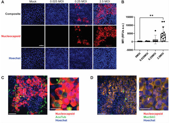 SARS-CoV-2 infection in PREDICT96-ALI airway tissues was characterized by IF microscopy. Figure 4A shows max projection images of PREDICT96-ALI devices containing donor 04401 tissues inoculated with SARS-CoV-2. The images exhibit greater abundance of SARS-CoV-2 nucleocapsid protein (red) as MOI increases. Strong expression of nucleocapsid protein is seen at 6 d.p.i. within the 2.5 MOI-infected tissues. Multi-cell clusters indicate SARS-CoV-2 replication and spread to neighboring cells, an observation also reported in prior studies working with in vitro primary upper airway models [16]. MFI quantification of SARS-CoV-2 infection demonstrates a significant increase in the expression of SARS-CoV-2 positive cells at 2.5 MOI (Figure 4B). Similar data from lower MOI infections were observed in donor DH01 (Figure S3). Collectively, these data indicate robust virus infection and the ability to closely track infection kinetics.
