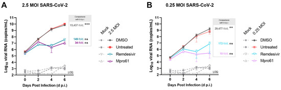 As an initial feasibility demonstration, tissues from donor 04401 were treated with two antiviral drugs during SARS-CoV-2 infection. The nucleoside analog remdesivir and the protease inhibitor Mpro-61 [26] (Figure S4) were added at 10 μM to basal media 1 h after infection and again on days 2 and 4. Untreated tissue and tissue treated with the antiviral vehicle (DMSO) supported robust infection through 6 d.p.i., similar to the infection observed in Figure 2D and Figure S1. Treatment with either remdesivir or Mpro-61 reduced viral genome copy numbers occurred on days 4 and 6 p.i. Tissues treated with antivirals yielded significantly smaller viral load as shown by the fold increase between 0 and 6 d.p.i. These effects were observed at both 2.5 (Figure 5A) and 0.25 MOI (Figure 5B).