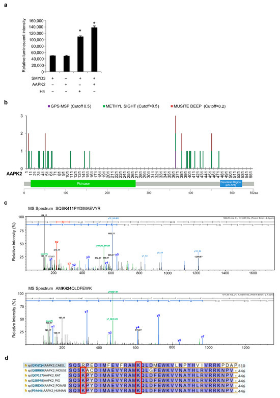 SMYD3 methylates AMPK. (a) In vitro methylation assay showing AMPK (AAPK2) methylation by SMYD3. H4 was used as a SMYD3 control substrate. * p < 0.05 vs active SMYD3 (b) In silico methylation prediction analysis. Three in silico prediction servers were used to identify AMPK consensus methylation sites: GPS-MSP, Methyl Sight, and Musite Deep. (c) MS/MS spectrum of SQSK411PYDIMAEVYR and AMK424QLDFEWK, two peptides obtained by double proteolytic digestion of SMYD3-methylated AMPK with the endoproteinases trypsin and Glu-C. (d) Multiple sequence alignment of human AAPK2 and homologous proteins from other species. UniProt IDs are indicated on the left. Lysines 411 and 424 (red boxes) are located in highly conserved regions. CAEEL: C. elegans, PONAB: Pongo abelii.