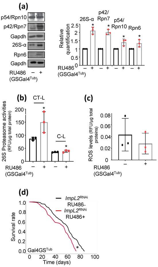 KD of ImpL2 increases proteasome subunits expression and peptidases activity; it also mildly decreases flies’ longevity. (a) Immunoblot analyses and relative immunoblotting quantification (n = 3) of tissue protein samples probed with antibodies against proteasomal subunits p54/Rpn10, p42/Rpn7, 26S-α, and Rpn6 in flies’ tissues after ImpL2 KD. (b) Chymotrypsin (CT-L)- and caspase (C-L)-like activities of 26S proteasome after ImpL2 KD. (c) ROS levels in flies’ somatic tissues after ImpL2 KD. (d) Longevity curves of ImpL2 KD flies vs. control flies (log-rank, Mantel–Cox tests: non-induced flies vs. ImpL2RNAi-induced flies p < 0.0001). In (a–c), flies were exposed to 320 μM RU486 for 7 days. Gapdh probing (a) was used to demonstrate equal protein loading. Bars, ±SD; n = 3, * p < 0.05.