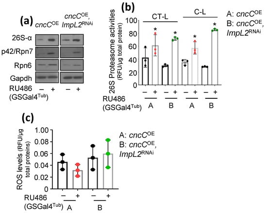 We recently found that sustained ubiquitous cncCOE in adult flies accelerates aging due to metabolic deregulation being evident by hyperglycemia and extensive lipolysis. We hypothesized that these phenotypes may also relate to increased ImpL2 activity; an IIS inhibitor and a cncC/Nrf2 transcriptional target [19]. We thus KD ImpL2 in cncCOE flies, using the GSGal4Tub driver, and found that this genetic intervention increased both proteasomal protein subunits expression levels (Figure 3a) and proteasomal peptidase activities, vs. solely cncCOE flies (Figure 3b), suggesting that UPP remains highly active likely as a result of enhanced IIS signaling (see above; [19]). Notably, the measurement of transgenic flies’ oxidative load showed that ImpL2 KD in cncCOE flies nulled the cncC/Nrf2 impact on the cellular oxidative load (Figure 3c). Thus, ImpL2 KD in the cncCOE background maintains increased protein synthesis quality control mechanisms, i.e., the ubiquitin proteasome pathway, in flies’ tissues.