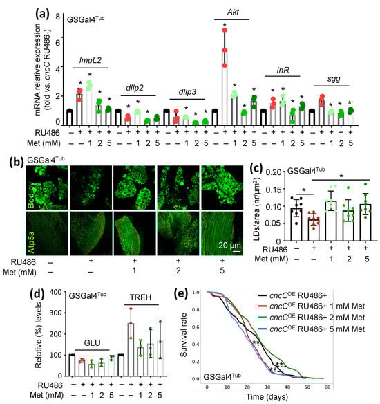 Considering that metabolic deregulation starts to be evident in transgenic flies at about 1 week post cncC overexpression [19], we started flies’ treatment with Met at day 7 post cncC transgene induction. Specifically, adult flies (7 days old) in this experimental “therapeutic” protocol were treated with 1, 2, or 5 mM of Met for 3 days. Our data showed that Met reduced lipolysis in the fat body (Figure S2a) and normalized GLU levels in the cncCOE flies’ tissues dose-dependently (Figure S2b). Finally, we found that treatment with 1 or 2 mM Met improved cncCOE flies’ health span (Figure 5e); similarly, starting Met administration at day 7 post cncC induction improved flies’ health span in all concentrations used, suggesting the potential advantageous outcomes of Met administration parallel to phenotype appearance (“symptoms” initiation) rather than during early adulthood (Figure S2c).