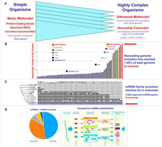 The critical, but so far essentially unexplored, impact of the noncoding genome in human health and disease [8,10,11,12] is nevertheless strongly suggested by the overwhelmingly expanding fraction of ncRNAs, sharply contrasting with only a modest increase in the number of protein-coding genes, during evolution from simple organisms to humans. Importantly, deep research into the vast realm of the noncoding genome during the past decades has led to a fundamentally enhanced appreciation of the multi-level complexity of the human genome.