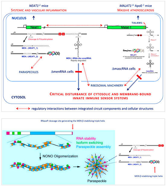 Multi-level functional integration of extended regions of the human genome, above and beyond individual noncoding RNAs. The NEAT1–MALAT1 genomic region encodes a biologically integrated circuit controlling innate immune sensing and cell–cell interactions. From an evolutionary perspective, the NEAT1–MALAT1 genomic region appears as a highly integrated RNA processing circuitry critically contributing to immune homeostasis. Its components MEN-β, MEN-ε, menRNA, MALAT1, TALAM1, and mascRNA are obviously set for well-balanced interactions with each other. Genetic ablation of any element therefore leads to major dysfunction. Beyond prior work in NEAT1 and MALAT1 knockout mice, a recent cell biological study identified menRNA and mascRNA as novel components of innate immunity with deep impact upon cytokine regulation, immune cell–endothelium interactions, angiogenesis, and macrophage formation and functions. These tRNA-like transcripts appear to be prototypes of a class of ncRNAs distinct from other small transcripts (miRNAs, siRNAs) by biosynthetic pathway (enzymatic excision from lncRNAs) and intracellular kinetics, suggesting a novel link for the apparent relevance of the NEAT1–MALAT1 cluster in cardiovascular and neoplastic diseases. For the long primary transcripts of NEAT1, a function of general cell-biological interest has been identified. They are critical for the formation of paraspeckles which are involved in multiple cellular functions, and possibly also in the broader context of micellization and the formation of biomolecular condensates essential for proper subcellular and nuclear compartmentalization. Obviously, molecules involved in these fundamental processes may deeply impact upon various cellular functions in a context-dependent manner, so that their observed association with diverse diseases is therefore not entirely unexpected. Overall, the NEAT1–MALAT1 genomic region may serve as paradigm of a biological integrated circuit fine-tuning multiple cellular processes covering innate immune sensing and cell–cell interactions. (Modified from Poller et al. 2023 [11] by permission from J. Clin. Med.).
