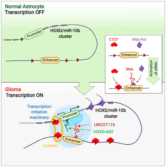 Promoter and enhancer RNAs regulate chromatin reorganization and activation of miR-10b/HOXD locus, and neoplastic transformation in glioma. miR-10b is silenced in normal neuroglial cells of the brain but commonly activated in glioma, where it assumes an essential tumor-promoting role. The entire miR-10b-hosting HOXD locus is activated in glioma via the cis-acting mechanism involving 3D chromatin reorganization and CTCF-cohesin-mediated looping. This mechanism requires two interacting lncRNAs, HOXD-AS2 and LINC01116, one associated with HOXD3/HOXD4/miR-10b promoter and another with the remote enhancer. Knockdown of either lncRNA in glioma cells alters CTCF and cohesin binding, abolishes chromatin looping, inhibits the expression of all genes within HOXD locus, and leads to glioma cell death. Conversely, in cortical astrocytes, enhancer activation is sufficient for HOXD/miR-10b locus reorganization, gene derepression, and neoplastic cell transformation. LINC01116 RNA is essential for this process. Our results demonstrate the interplay of two lncRNAs in the chromatin folding and concordant regulation of miR-10b and multiple HOXD genes normally silenced in astrocytes and triggering the neoplastic glial transformation. (Modified from Deforzh et al. 2022 [88] by permission from Mol. Cell).