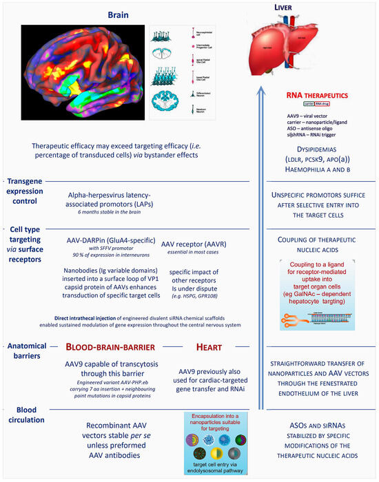 Summary and outlook. On the right side, this figure aims to summarize- the molecular and cellular basis of liver targeting of nucleic acid-based drugs, which is already being applied clinically for several disorders. Here, drug delivery is facilitated by the fenestrated endothelium of the liver and the availability of a safe and efficient hepatocyte-specific ligand-receptor system. The left side outlines the multiple challenges arising once targeting to other organs is attempted, focusing upon brain delivery. Targeted and safe delivery of any nucleic acid-based (siRNA, ASO) drug to specific regions of the brain appears as far greater challenge than liver targeting or ex vivo blood stem cell modulation. A remarkable spectrum of brain-targeting approaches encompasses synthetic nanoparticles and viral vector, yet so far, none of these are established with respect to key efficacy requirements (Figure 5). AAV vectors encounter high interest for brain-targeted therapies since genetically engineered and surface-modified (pseudotyped) versions of this vector have been extensively studied in other fields of medicine (e.g., hematology, cardiovascular medicine). The blood-brain-barrier (BBB) constitutes a particularly challenging anatomical barrier against nanoparticle or vector based drug delivery. Remarkably, the serotype AAV9 is capable to cross the BBB under certain conditions, raising the possibility of intravascular administration as a non-invasive delivery route of nucleic acid-based drugs to the CNS. Noteably, this same AAV serotype is also able to enter the myocardium across the tight cardiovascular endothelium (impermeable for other AAV serotypes) and was previously employed for cardiac-targeted gene transfer and RNA interference therapy. Regarding the next step of delivery, little is known about differential tropism of currently available AAV variants for distinct brain cell types of specific therapeutic interest. Recent high-throughput screens have identified host proteins essential for AAV delivery in a comprehensive manner and revealed unanticipated complexity and serotype specificity of the entry process. Theoretical predictability of any in vivo effects of vector modifications is therefore limited and experimental validation essential. The figure depicts recent experimental approaches to improve BBB passage and brain cell type-specific delivery. Starting from AAV9 holding promise for trans-BBB therapy, AAV-PHP.eB was engineered by insertion of a 7-amino acid peptide and point mutations of neighboring residues into the AAV9 capsid and enhanced CNS delivery in mice only under certain conditions. Similar challenges with regard to clinical translation, generated by species differences, have been extensively investigated before for another “hard target”, i.e., the heart. Instead of recognizing the glutamate receptor GluA4 through a displayed GluA4-specific DARPin, AAVs deficient in HSPGs attachment resulted in preferential >90% transduction of interneurons. Another highly innovative strategy employs membrane protein-specific nanobodies inserted into a surface loop of the VP1 capsid protein of AAVs. Nanobody-VP1 fusion was applied to AAV1, AAV2, AAV8, and AAV9 and effectively re-directed the target specificity of all these AAV serotypes. Beyond stability in the blood circulation and capability to cross the blood–brain barrier, transgene expression stability or even control is also desirable. Alphaherpesvirus latency-associated promoters (LAPs) enabled stable, pan-neuronal transgene transcription and translation from AAV-LAPs in the CNS for 6 months. Thus, these LAPs are suitable candidates for AAV-based CNS gene therapies requiring chronic transgene expression after one-time viral-vector administration.