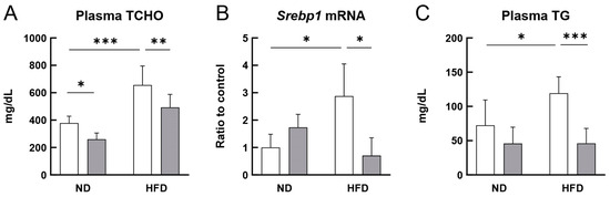 Effects of rhamnan sulfate (RS) on the plasma lipid parameters and sterol regulatory element-binding protein 1 (Srebp1) mRNA expression. Apolipoprotein E-deficient (ApoE−/−) mice were fed either a normal diet (ND) or a high-fat diet (HFD) for 12 weeks. The groups were divided into two groups: one group not treated with RS (open columns) and the other with 0.1% RS (gray columns). Graphical representation of (A) plasma levels of total cholesterol (TCHO), (B) Srebp1 mRNA levels in the aorta quantified using quantitative real-time PCR (qPCR), and (C) plasma levels of triglyceride (TG) in each group of mice. Data are presented as the mean ± standard deviation (SD). * p < 0.05, ** p < 0.01, and *** p < 0.001 indicate significant differences between each group using two-way ANOVA (n = 5 or 6 for lipid parameter assays; n = 3 for qPCR).