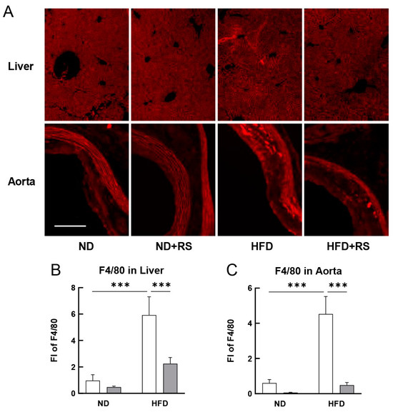 Effect of RS treatment on macrophage infiltration in the organ tissues of ApoE−/− mice fed either an ND or HFD supplemented with or without RS. (A) Immunohistochemical analysis of F4/80 (marker of macrophage) in the liver and aorta of mice in the ND, ND + RS, HFD, and HFD + RS groups. Scale bar = 100 μm. Graphical representation of FI of F4/80 in the (B) liver and (C) aorta of mice in the ND and HFD groups. Open and gray columns indicate the RS-untreated and RS-treated groups, respectively. The data are shown as the mean ± SD. *** p < 0.001 indicates significant differences between each group using two-way ANOVA (n = 4).