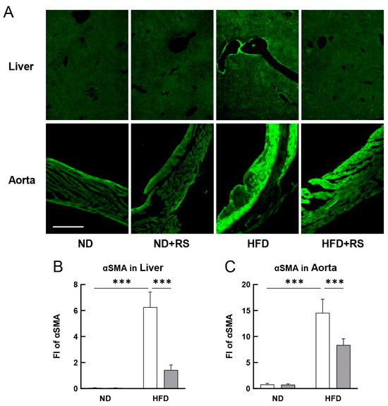 Effect of RS treatment on alpha smooth muscle actin (αSMA) expression in the liver and aorta of ApoE−/− mice fed an ND or HFD supplemented with or without RS. (A) Immunohistochemical analysis of αSMA in the liver and aorta of mice in the ND, ND + RS, HFD, and HFD + RS groups. Scale bar = 100 μm. Graphical representation of FI of αSMA in the (B) liver and (C) aorta of mice in the ND and HFD groups. Open and gray columns indicate the RS-untreated and RS-treated groups, respectively. The data are shown as the mean ± SD. *** p < 0.001 indicates significant differences between the respective groups using two-way ANOVA (n = 4).