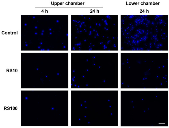 A transwell migration assay (Corning Inc., Corning, NY, USA) was performed using mouse macrophage-like RAW264.7 cells [31] obtained from RIKEN (RCB0535, Tsukuba, Japan). Dulbecco’s Modified Eagle′s Medium low glucose (Sigma-Aldrich, St. Louis, MO, USA), supplemented with 10% fetal bovine serum (Sigma Chemical Company, St. Louis, MO, USA) and 1% penicillin-streptomycin (Fujifilm Wako Pure Chemicals), was used for the cell culture. The cells (1 × 105) were suspended in a serum-free medium and seeded in the upper chamber. The lower chamber was filled with 500 μL of whole serum culture medium. RS (10 or 100 μg/mL) was added to the upper or lower chambers and incubated for 4 or 24 h. The medium was then removed from the upper and lower chambers, and the chambers were washed twice with phosphate-buffered saline. The cells migrated from the upper chamber to the lower chamber through a membrane filter. The untreated cells were used as controls. The nonmigrating cells in the upper chamber were scraped off the top surface of the membrane filter using a cotton swab. The cells that migrated to the underside of the membrane filter were fixed with 4% formaldehyde solution, stained with Hoechst/4’,6-diamidino-2-phenylindole (DAPI), and quantified using light microscopy.