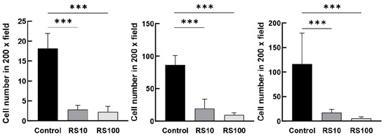Effect of RS on the migration of RAW264.7 cells treated with or without RS. RS was added to the upper or lower chamber and incubated for 4 or 24 h. Cells that migrated to the underside of the membrane filter were fixed and stained with Hoechst33342 solution. Photographs (×200) of the representative image of cells stained with Hoechst are shown. Scale bar = 100 μm. The graphs on the left and in the center show the number of migrated cells at 4 and 24 h after placing RS in the upper chamber, respectively. The graph on the right shows the number of migrated cells 24 h after placing RS in the lower chamber. Data are shown as the mean ± SD. *** p < 0.001 indicates significant differences between the respective groups using one-way ANOVA (n = 5).
