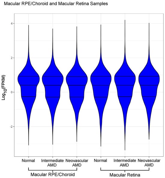 Violin plot of Log10-transformed FPKM counts from 27 donor eye samples with both the macular RPE/choroid and macular retina shown. Abbreviations: AMD, age-related macular degeneration, RPE, retinal pigment epithelium, FPKM, fragments per kilobase of transcript per million mapped reads.