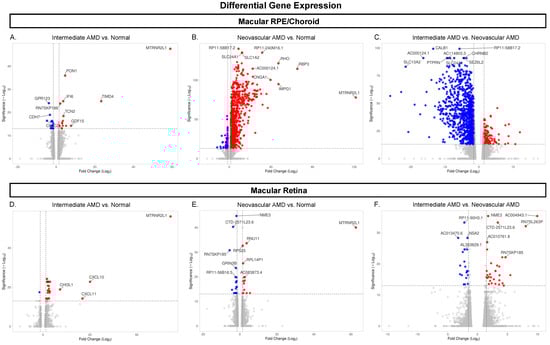 A total of 26,650 genes were expressed in the macula RPE/choroid and/or macula retina. Within phenotyped normal eyes, 16,638 genes showed significant (FDR ≤ 0.05) differential expression between macular RPE/choroid and macular retina tissues with a minimum fold change ≥ |1.5|. As illustrated in Figure 2, within macular RPE/choroid tissues, significant differential expression was observed for 40 genes between iAMD and normal eyes, 1204 genes between NEO and normal eyes, and 1194 genes between iAMD and NEO eyes (Figure 2A–C, Table S1). Within macular retina tissues, 30 genes were differentially expressed between iAMD and normal eyes, 41 genes were differentially expressed between NEO and normal eyes, and 50 genes were differentially expressed between iAMD and NEO donor eyes (Figure 2D–F).